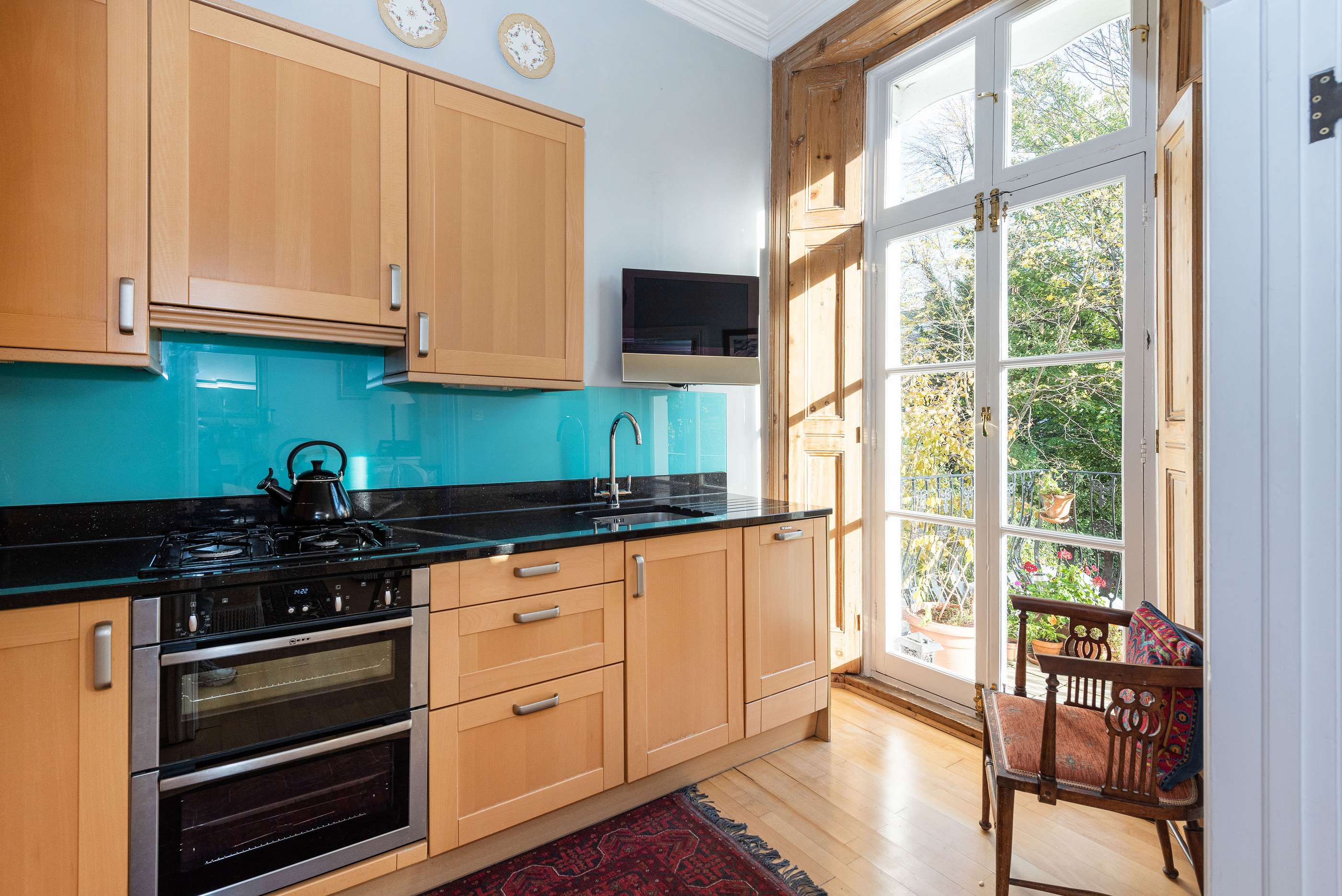 A grand living area, complete with a fireplace, high ceilings, and French doors opening out onto the private balcony is a delightful space in which to unwind. The kitchen is modern and spacious, complete with a TV and all the culinary items required for cooking up a feast after a busy day in the city. The dining table is in the living room and can seat four.