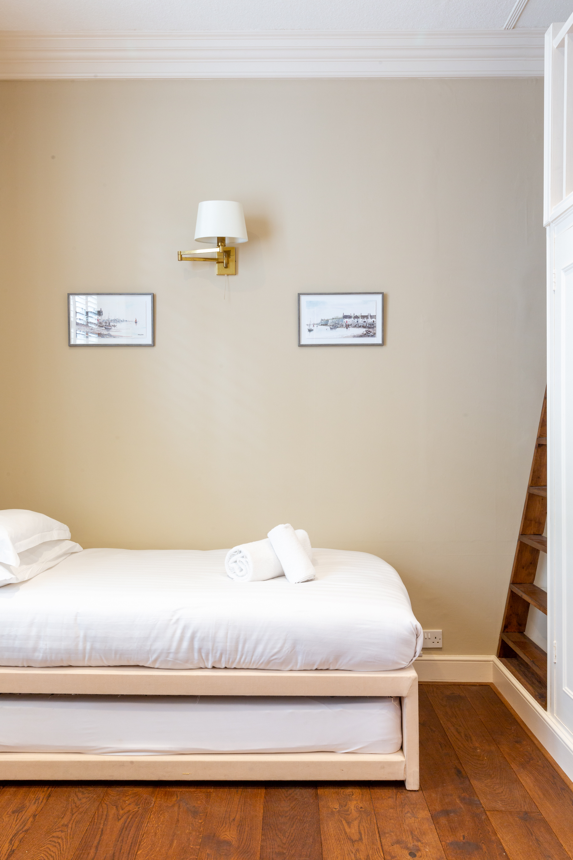 This flat is located on the lower ground floor, with one flight of external stairs to access the apartment. Please note the wooden ladder to access the double bed.