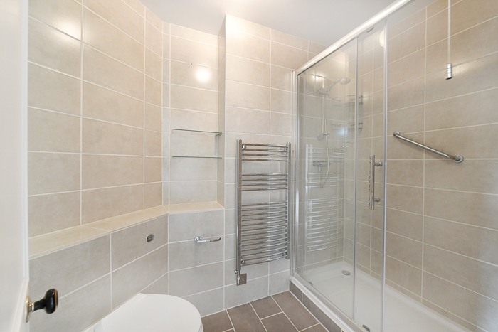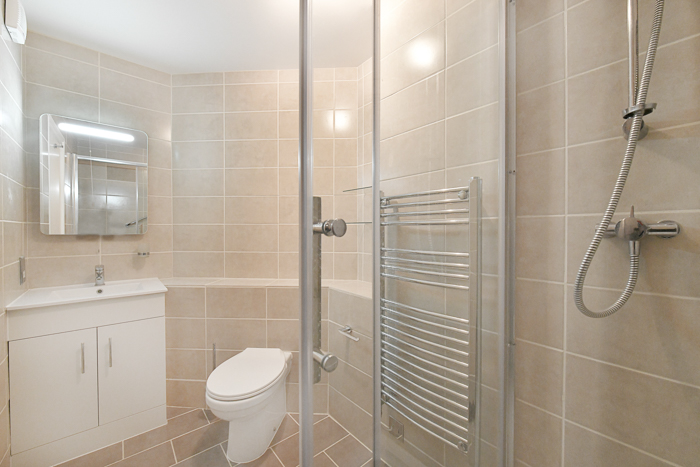 The home has two bedrooms, a master with UK king size (5ft wide) bed and en suite shower room, and a second single bedroom with a large single bed. A family bathroom serves this bedroom off the main corridor.