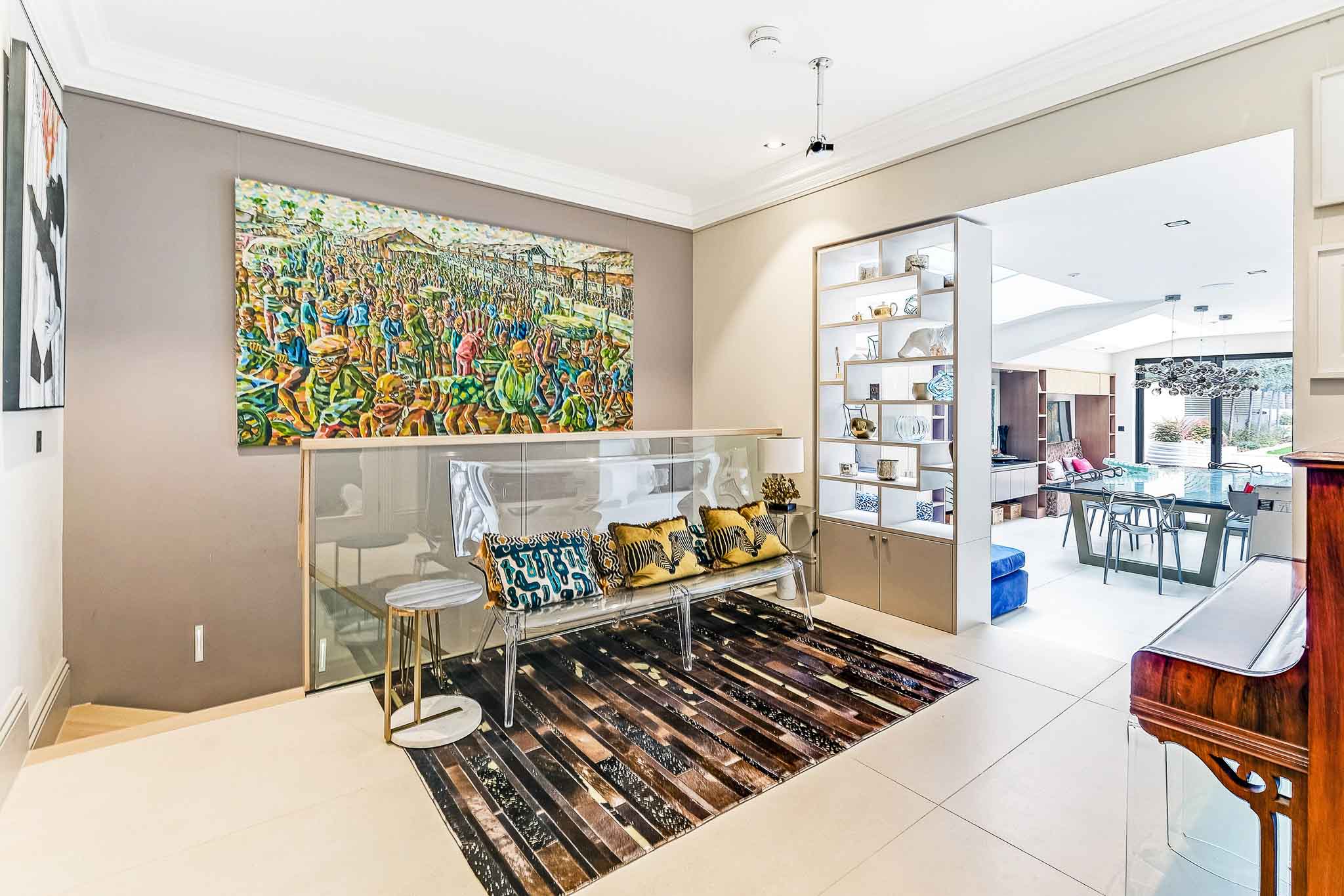 You are welcomed into a contemporary living area, tastefully decorated with conversational pieces and comfortable furnishings. An open-plan fully equipped kitchen and a dining area are down the hall, boasting a 12-seater dining table perfect for Sunday brunches; serviced by a guest wash closet. The large patio doors open onto a lush dual garden, one dedicated to children's outdoor activities and another with outdoor seating and dining facilities, for those warm summer months.