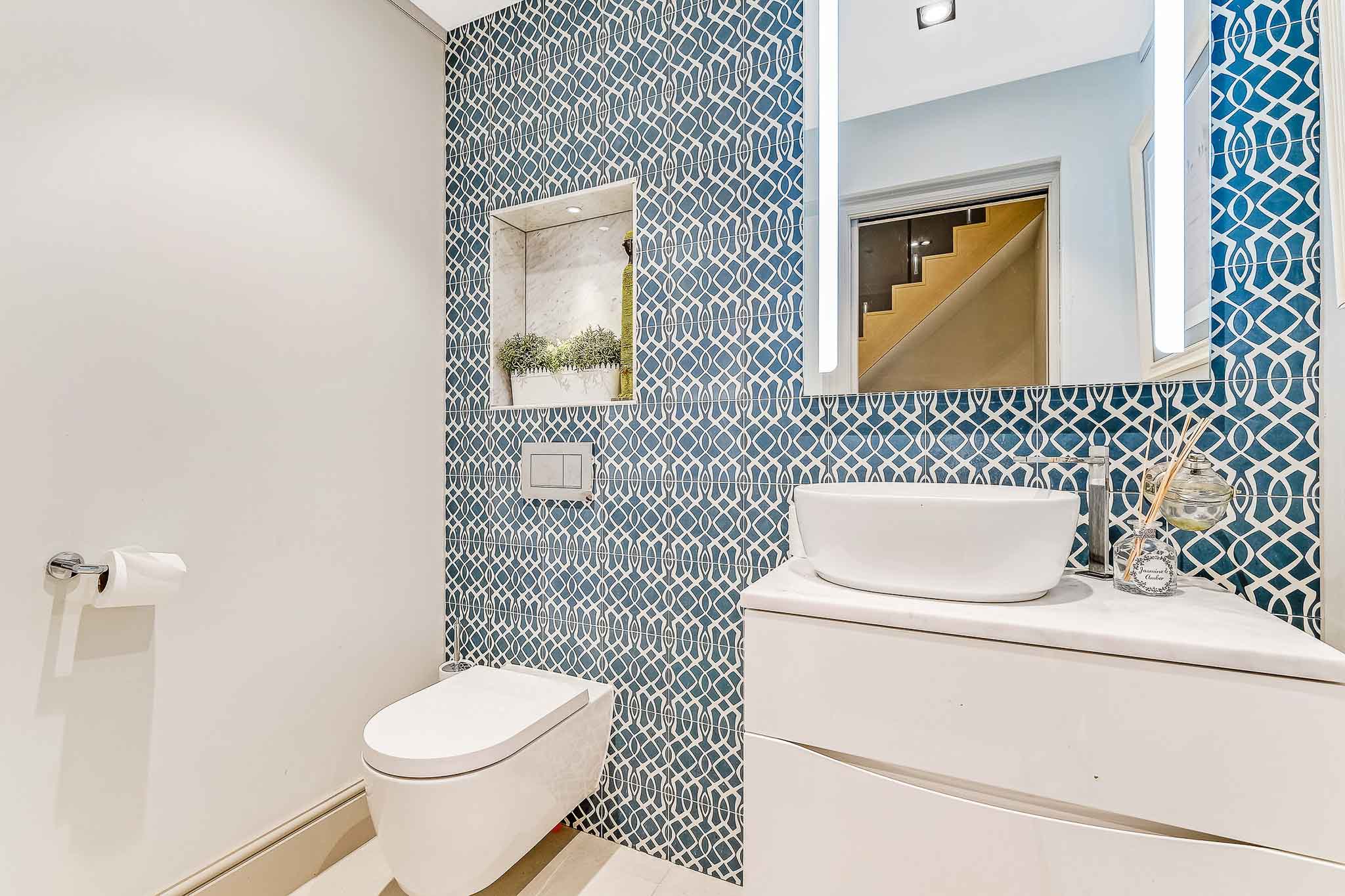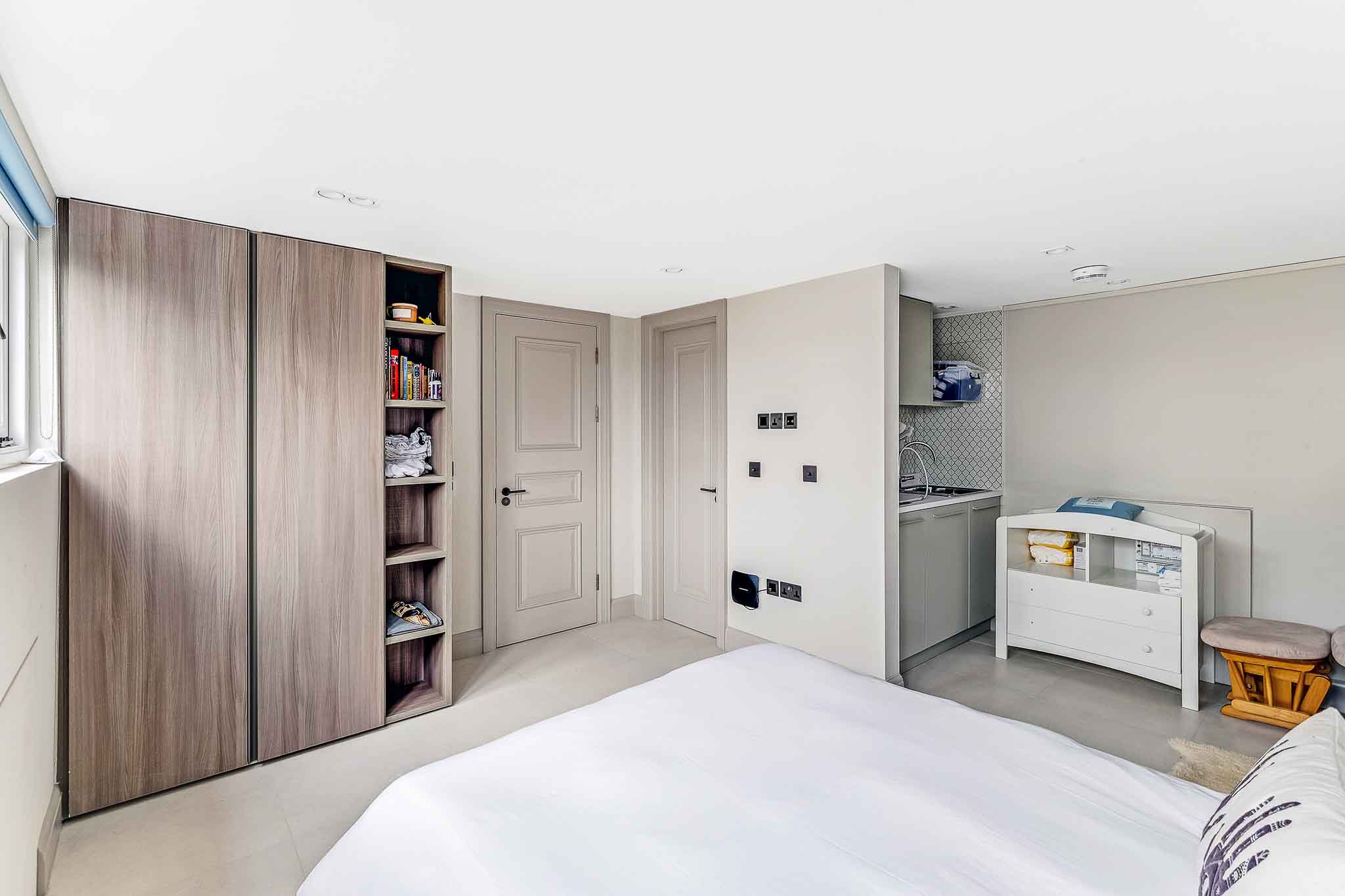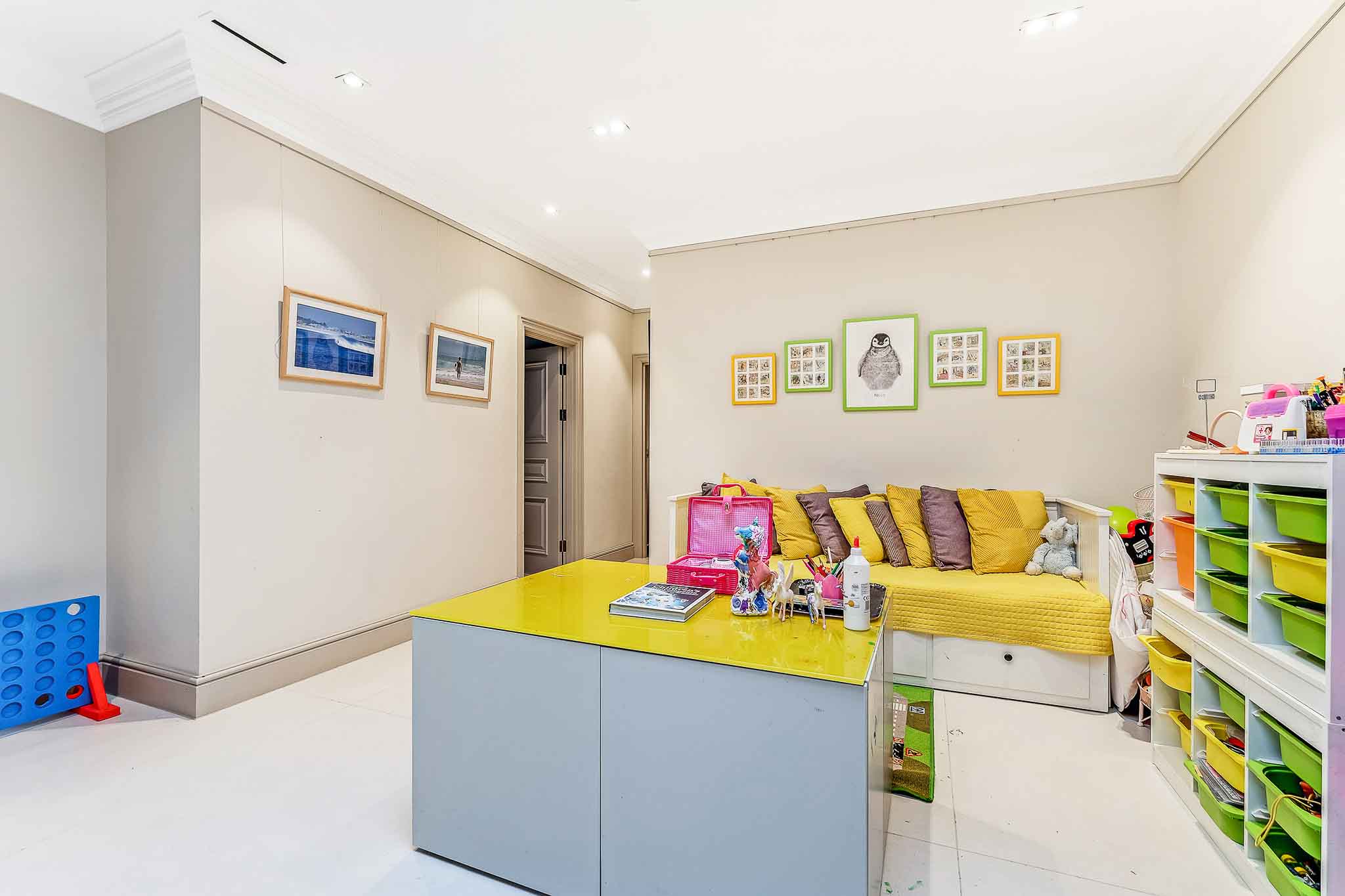 Down a flight of stairs and into the basement, you’ll find a cinema with a 7ft projector screen, a fully equipped kitchen, a playroom, a wash closet, an office as well as an enticing entertainment and fitness area. There is also a bedroom with a UK double bed (4.5ft wide) on this floor, serviced by an ensuite bathroom with a shower stall.
